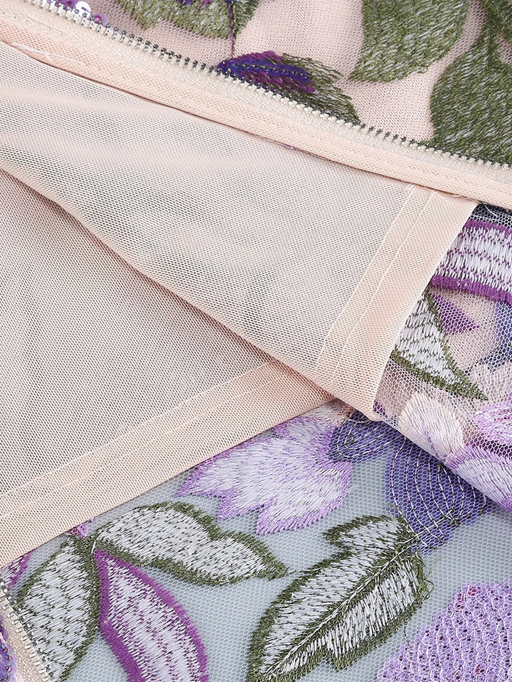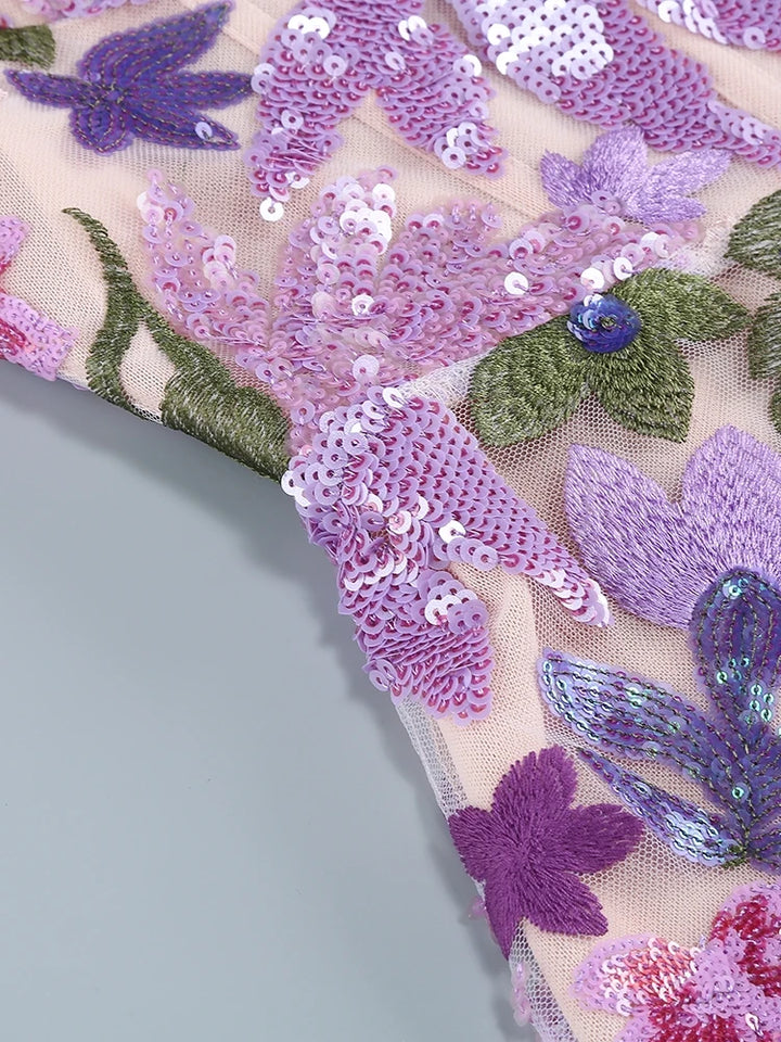 فستان نسائي طويل مثير جديد فاخر مزين بالترتر والزهور للنساء بدون حمالات باللون الخزامي مزين بالترتر